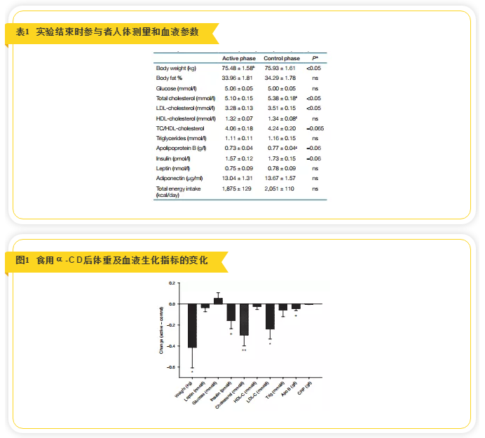 為了探討α-CD對健康人群血糖和血脂水平的影響,美國加州大學(xué)戴維斯分校醫(yī)學(xué)院內(nèi)分泌科、臨床營養(yǎng)和血管醫(yī)學(xué)中心的研究人員進(jìn)行了一項(xiàng)為期2個月臨床研究,研究采用隨機(jī)、對照、雙盲和自身交叉研究的方式。他們募集了41名體重超重的成年人志愿者,包括14名男性和27名女性,除超重外,身體健康,無任何其他慢性病,年齡在18~65歲之間,體重指數(shù)25 ~30kg/m2。參與者在試驗(yàn)前測量各類身體參數(shù),然后隨機(jī)分配到兩組,α-CD實(shí)驗(yàn)組即active組和對照組即control組,每人每餐食用2gα-CD或普通纖維素,于進(jìn)餐開始后1小時內(nèi)服用完。1個月后,抽血檢測各種指標(biāo),之后交叉到相對應(yīng)的實(shí)驗(yàn)或?qū)φ战M,再進(jìn)行一個月,總實(shí)驗(yàn)期限是2個月,試驗(yàn)結(jié)束后再空腹測量身體各類參數(shù)。試驗(yàn)過程中依從性差不服從要求的13人離開實(shí)驗(yàn),整個過程中參與者能量攝入不受限制,不改變平時的飲食和鍛煉習(xí)慣。