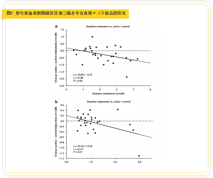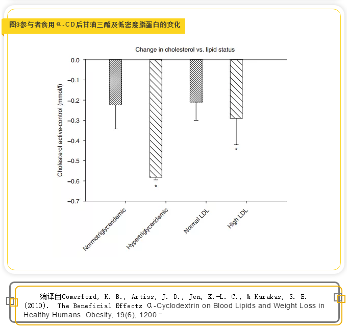 這項(xiàng)研究結(jié)果顯示與對照組相比,試驗(yàn)組人群每天食用6gα-CD,一個月后體重平均降低0.4公斤,血清總膽固醇水平降低5.3%,低密度脂蛋白水平降低6.7%,載脂蛋白B濃度降低了5.6%。雖然兩組的空腹血糖沒有明顯變化,但胰島素水平下降了9.5%,提示胰島素敏感性增加(見表1,圖1)。研究還發(fā)現(xiàn),志愿者試驗(yàn)前血液膽固醇水平越高,食用α-CD期間膽固醇降低效果越好,同樣,試驗(yàn)前甘油三酯水平越高的人, 補(bǔ)充α-CD期間降低的效果也越好(見圖2)。試驗(yàn)前血液甘油三酯水平均大于2.26 mmol/L的參與者,在食用1個月的α-CD后膽固醇水平降低了11.1%。而試驗(yàn)前血液甘油三酯水平均低于1.69mmol/L的參與者,α-CD干預(yù)后膽固醇水平僅降低了4.3%,無顯著性差異(見圖3)。這些發(fā)現(xiàn)表明,相對于血脂正常的人,高血脂患者補(bǔ)充α-CD后的改善效果要更明顯。